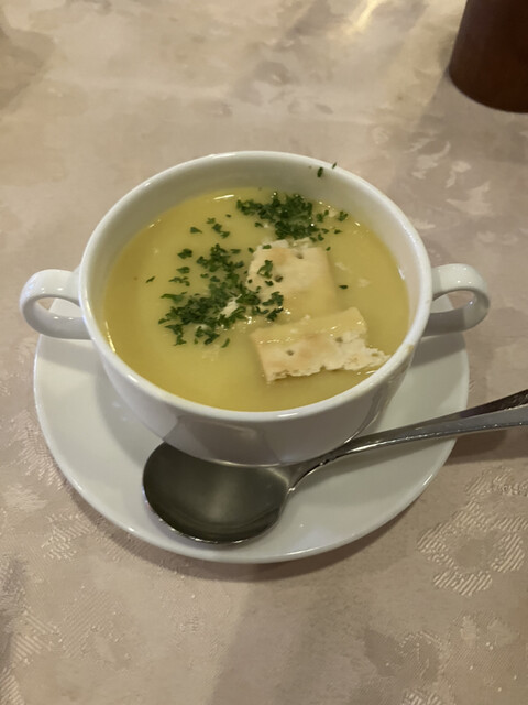 13時12分入店。平日のこの時間でも、店内は混んでいて、手前の2テーブルが空いているだけでした。ランチメニューから、カニクリームコロッケとローストポークをカミさん。私はカレーとヒレカツと迷ったのですが、 他席を見るととても美味しそうだったので、メンチカツをオーダーしました。混んでるし、時間かかるかなと思いましたが、まずすぐに提供されたコーンスープをいただきます。コーンの甘味が充分に感じられ、それでいてしつこさのない美味しいスープです。カップも大きめで量も結構あるのが嬉しいですね。スープを飲み干す頃には、二人とも料理が届きました。早くて驚きです。メンチカツにもローストポークにもデミグラスソースが充分にかかっています。このソースは、家庭では食べれない、外で食べる洋食屋のものですね。メンチカツも大きくて食べ応えありました。サクッとして美味しかったです。付け合わせの野菜も量もあり良かったです。カミさんも満足したようで、結構な量を平らげてました。食後のコーヒーもついて、二人で2200円は、中々お値打ちです。近くても、知らない美味しい店は、あるものですね。カレーとかオムライス、ハンバーグと何度か訪店したいと思います。