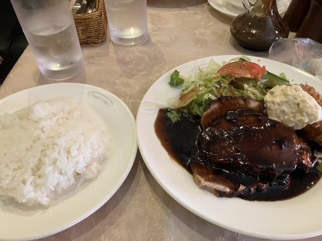 エビフライと息子はチーズハンバーグをオーダー。まずは、いつものコーンスープ。甘さの具合が本当によろしい。あっという間に飲んでしまうのでおかわりしたいと思います。混んでいても、さほど待たずにエビフライとハンバーグが到着。エビフライは有頭3本。カリッと美味しく、またタルタルソースが秀逸。流石ですね。ハンバーグは、この店のデミグラスソースがたっぷりかかっており当然美味しいです。大きさもありで中々良いですね。付け合わせのサラダもドレッシングの出来栄えよく、この店やっぱり凄いです。これからも、通いますご馳走様。