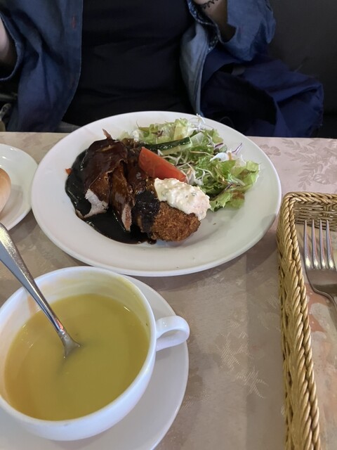 11時15分頃入店。先客2人後客1組。チーズハンバーグとカミサンはハヤシライスをオーダー。ハヤシライスには、スープがつかないので店員さんに聞いたところ日替わり料金にするとオーダー可能とのことで、プラス150円で、カボチャの冷たいスープとの私は大好きな暖かいコーンスープを。ハヤシライスはいつものとおりすぐに提供されましたが、ハンバーグは丁寧に調理されているようで、カミサンがほぼ食べ終わる頃に提供されたのました。カミサンはハヤシライスの味にも量にも満足したようでした。スープは、カボチャはあまり甘みがないさっぱりしたスープでコーンの甘みたっぷりのスープがやはり美味しいなあと感じました。次回からは、スープには迷わなくて大丈夫そうです。ハンバーグにはたっぷりのデミグラスソースがかかっており、大きさも含めて満足しました。ソースが残ったので、パンにつけて食べたいなあと思いました。サラダも野菜たっぷりで、トマトがとても甘くて美味しかった。次回は何を食べるか迷うのも楽しみです。接客も感じの良いお店です。