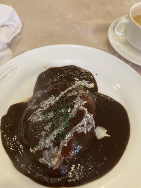 11時20分頃入店。初めて奥のテーブルに座りました。ナイフフォークもスプーンも一組しかなかったので、こちらは基本的には一人席なのでしょうか?息子がスプーン追加してました。私はチーズハンバーグ、息子はハヤシライスにスープ追加でオーダー。ハヤシライスはすぐに、続いてハンバーグも提供ありました。いつもスピーディーなのもこの店良いところです。ハンバーグはそこそこ大きさもあり、デミグラスソースもたっぷりかかって満足な一品です。欲を言えば海老フライとか揚げ物とのセットとか有ればさらに良いのですが。何を食べても美味しいので、メニュー選択に結構迷ってしまいます。ハヤシライスも一口いただきましたが、凄く美味しいです。アイスコーヒーもついて、いつもどおり満足な一食でした。