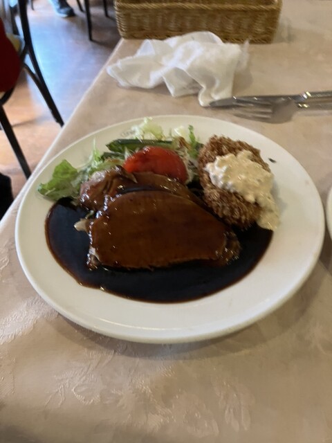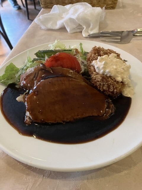 料理への期待が高まったとこでメインいただきます。ホワイトソースは本当は苦手でカニクリームコロッケはあまり食べないのですが、ここのそれは大好きです。たっぷりのドミグラスソースをつけて食べるのがまた美味しい。ローストポークは、こんなに量あったかなと思うくらい充分な量でたっぷり野菜と共に満足しました。