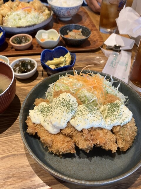 11時30分過ぎ、次男とこの辺で美味しい洋食系の定食をとリクエストしたところ、こちらに行ってみようと。12時前だしと思ってだのですが、すでに10人以上並んでいます。せっかくなので並ぶことにしました。メニューがたくさんあり随分迷いましたが、人気とあるマグロかつをタルタルソースで。次男はプリエビマックスで。