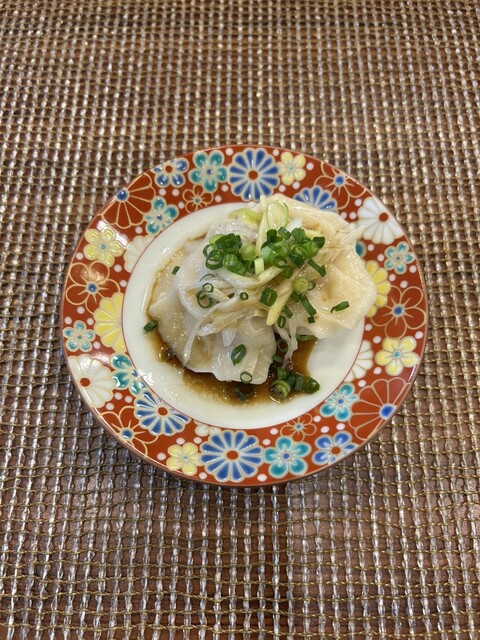 すじこと烏賊、穴子の湯切り、海月と蒸し鶏の棒棒鶏。すじこと烏賊の組み合わせは特に美味しい。
