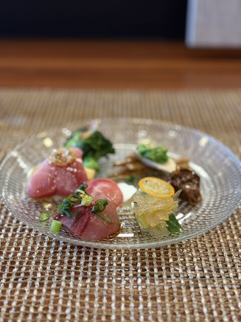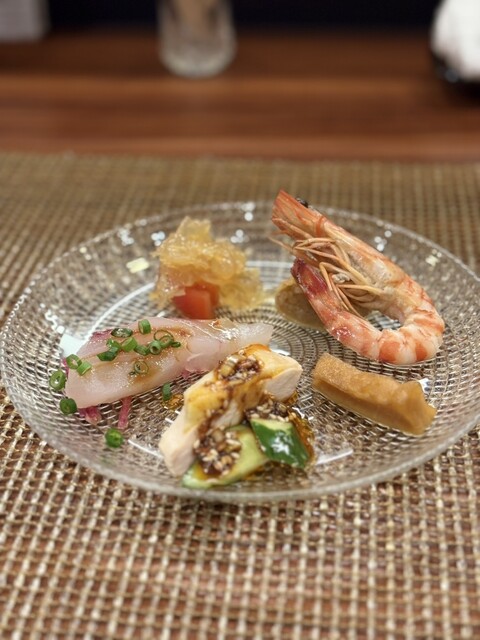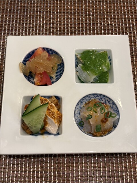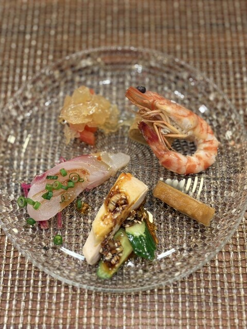 鯖、天然平目、みやざき地頭鶏、蓮根、山うどのXO醬和え、海月と芽キャベツ