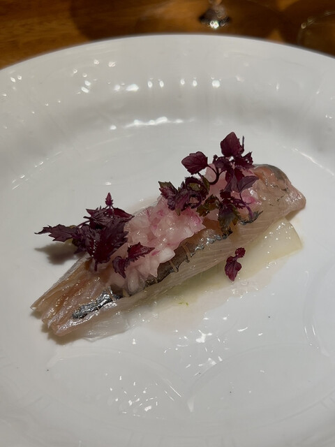 鯵とアオリイカの魚醤風味 赤玉葱と花穂紫蘇