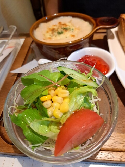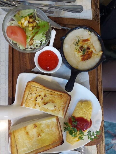 妻→グラタン・オムレツ・トースト・サラダのランチセット+コーヒー+プリンパフェ