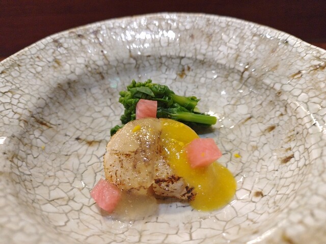 先付。金柑のジュレが帆立の旨みを際立たせる。