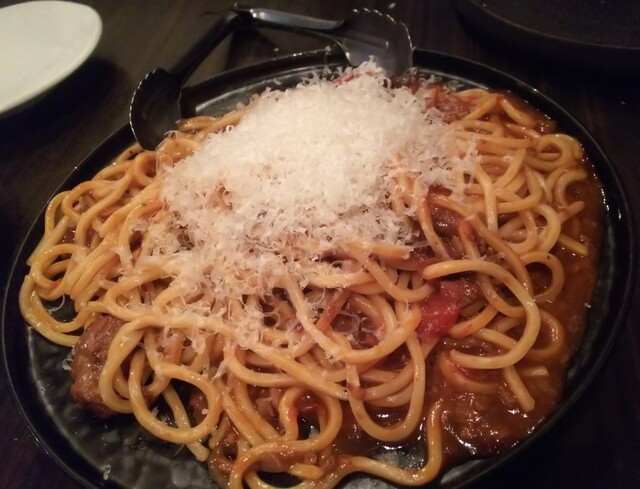 この和牛ボロネーゼ、麺が開花楼のもちもちの太麺で、ソースにはビーフシューのお肉も入っているそうで、仕上げにその場でチーズもかけてくれるんですが、本当にとってもおいしかったので、〆は和牛ボロネーゼおすすめです。