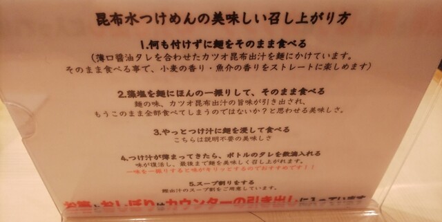 昆布水の粘土が結構ねっとりとしていて、昆布の旨味が麺に絡み付いてる感じ。