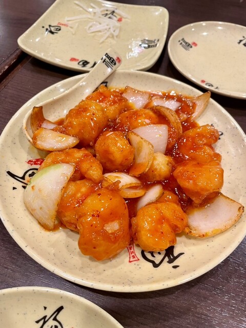 次は、鶏もも肉とピーマン、玉ねぎの唐辛子炒め(850円)と自家製チャーシュー五目チャーハン(800円)を追加注文。鶏もも肉は塩味強めの唐揚げ♡素揚げの玉ねぎとピーマンも美味しくて、チャーハンはパラパラで、香ばしくてここ何でも美味しい♡美味しすぎるので、最後エビチリ(850円)を注文。甘くないエビチリでした!さっぱりしてて、美味しい。