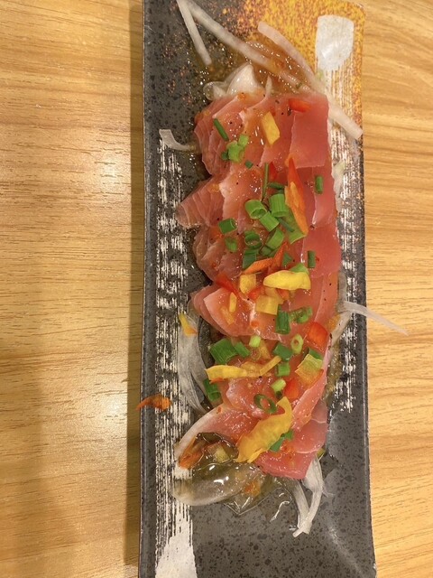 料理はまずマグロのカルパッチョを注文。マグロが新鮮で臭みがなく、さっぱりした味付けなので最初の一皿にちょうどいい感じでした。続いてタコの唐揚げ。外はカリッと、中は程よく弾力があって噛むたびに旨みが出てきます。お酒が進む系で、気づいたらお皿が空いていました。