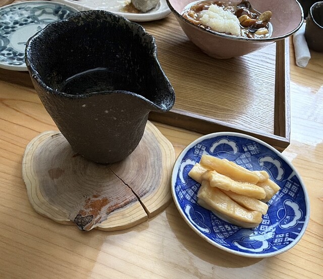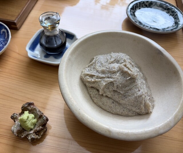 平日の開店時間少し後(11:29下呂駅下車、直ぐにタクシーで店へ、所要数分)に着きました、ドライバー曰く今日は空いてますねと。幸い店外に待ち列は無く、店内の待合に通され(2組目)ました、我々の後に2-3組が続いて並ばれました。1巡目の方々の退店に合わせて半時間後に案内されましたが、口コミの方々からすれば、まずまずスムーズに済んだかと。幸い蕎麦掻き(限定10)を含め品切は無く、蕎麦三昧に蕎麦掻き、天麩羅、蕎麦饅頭を追加としました。どの品も手抜き無く、評価が高いのも理解しました。スタッフの方々の接客が丁寧で、気忙しい蕎麦屋をイメージしていたのですが、全く違いました。温かい接遇を受けながら、美味しい料理を頂けました。蕎麦に加えて、なめこや芋、葱の美味しさも印象的でした。