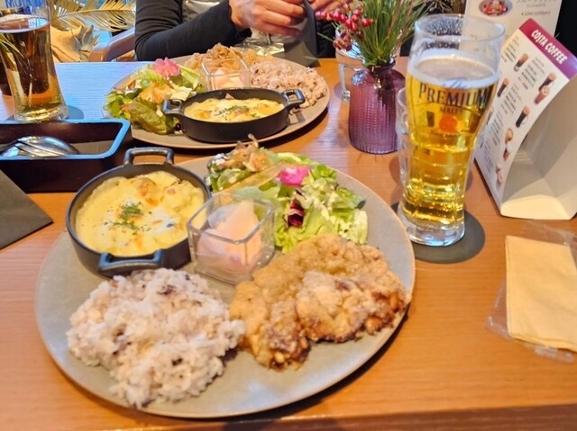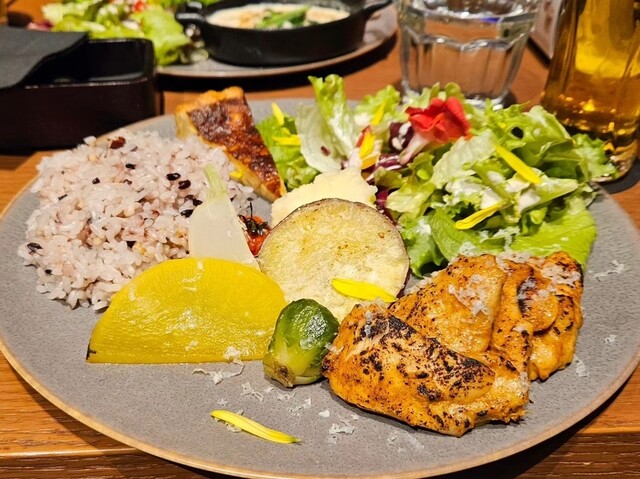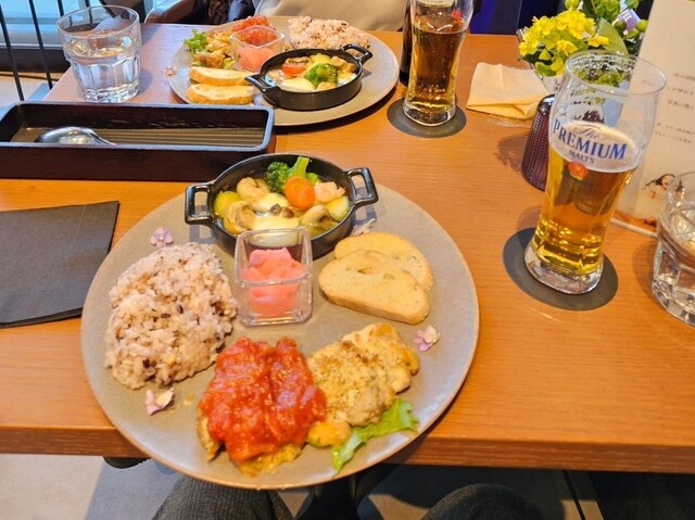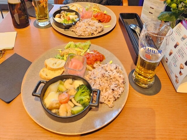 ■2人とも『今月のBloomy'sプレート~香草パン粉のチキンソテー トマトソース、アヒージョとバケット、根菜の甘酢漬け、十五穀米~』、および、