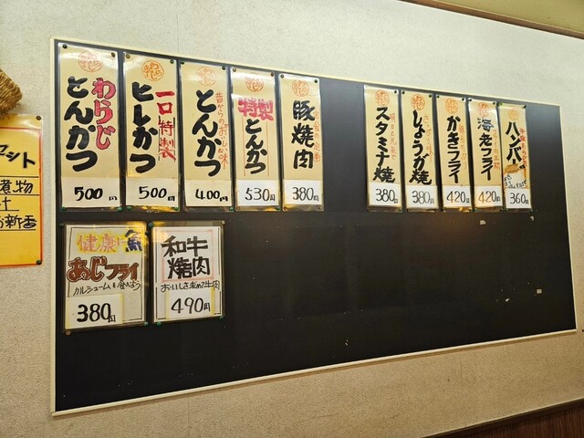 とんかつは4種類(わらじとんかつ、ヒレかつ、とんかつ、特製とんかつ)。しょうが焼き、ハンバーグなど定食屋さんの定番メニューも揃う。