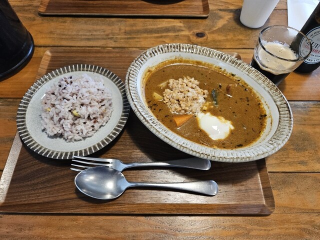午前中雨天、午後から曇天の水曜日 (16~19℃) 。今週月曜日から「近所の食べ友」が手術入院で不在のため、月内は基本的にソロ活確定。足下も悪いので、自宅から直ぐに位置するスープカレー店でランチ。