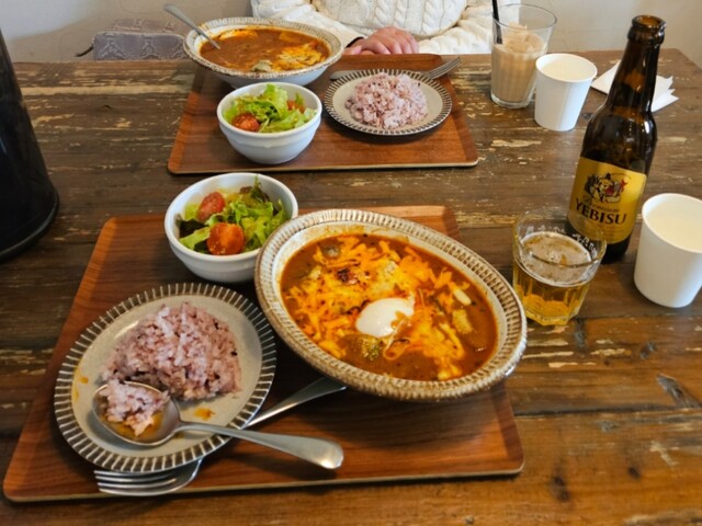 ◼自分が『スタッフおすすめ 温玉チーズスープカレー』『サラダ』『エビスビール』。
