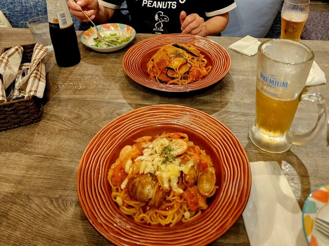 自分の『海の幸のヴェスビオ火山風』は、上にとろけたチーズがかかっており、少しピリッと辛いトマトソースと上のチーズが相性抜群。そして麺の太さは普通より少し細い感じで、具材は、えび、あさり、イカ等々が揃い、海の幸をたっぷり楽しめる。