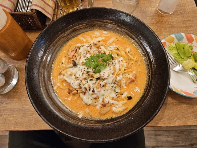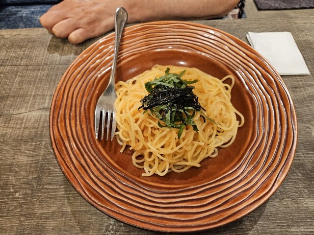 自分の『明太子の焼きカルボナーラ・フェットチーネ』は、明太子の旨味とカルボナーラの濃厚さがマッチした香ばしさが加わる人気の絶品メニュー。フェットチーネ(平打ち麺)のモチモチとした食感が濃厚なソースによく絡み、明太子の粒感と香ばしさがアクセント。