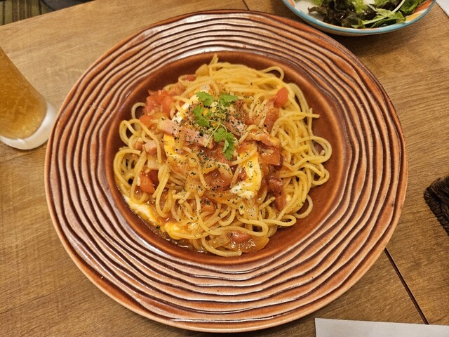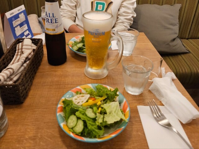 ◼相方が『ナスとベーコンのナポリターナ』『ランチサラダ』『オールフリー』『アイスコーヒー』、および、