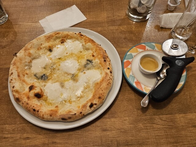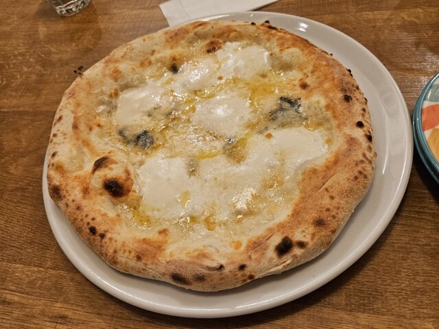 シェアした『クアトロフォルマッジ&ハチミツ』はパルミジャーノ・ゴルゴンゾーラ・ゴーダのチーズを使い、濃厚な塩気と香りが特徴のピザ。はちみつをかけることで、チーズの塩気と甘みが絶妙なバランス(甘じょっぱい)を生み出し、濃厚な風味がさらに引き立つ。