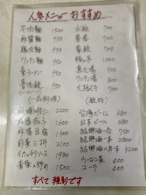 台湾に旅行してから、夜市などで食べた美味しい台湾料理を探して「台湾料理」を看板に掲げるお店に幾度となく訪問してきました。今回は横浜中華街。横浜中華街には今までにも何度か来ていますが、どちらかというと有名店ばかり。食べた料理も広東料理や四川料理など。今回は初の台湾料理。食べログでも高評価でワクワクしながら店を探したました。しばらく前と違って中華街の店もずいぶん変わった印象です。中華街大通りから中山道に入ります。目指すお店は関帝廟の近くなのでわかりやすいですが、外観は他の店に比べて派手さはなく、注意していないと見過ごしてしまいそうでした。時刻は18時半近く。いっぱいかと思いましたが、幸い一つテーブル席が空いていて、すぐに案内されました。席に着きメニューに目を通します。必食と決めていたルーローハンと台湾で食べるチャンスを逃した魚丸湯、それからお店オススメの麻醬麺、それと飲めると思っていなかった台湾ビールをオーダー。オーダー後に店内を見回すと、オススメの第一位が麻醬麺、二位がルーローハン、三位が魚丸湯でした。これを見て期待は大きく膨らみます。店を切り盛りするのはいかにも穏やかそうなご夫婦のようです。いろいろ教えてくれたお父さんは非常に優しい方。食事がさらに美味しくなります。いただいた料理はもう全て絶品。麻醬麺は胡麻ペーストが多分に使われたまぜそば系で少し酸味を感じます。お父さん曰くセサミン豊富でお肌に良いとのこと。ルーローハンはもう間違いなし。台湾旅行後、日本で食べたルーローハンの中ではダントツの美味しさでした。添えられた煮卵も五香粉かわかりませんが、サイコーな仕上がりです。台湾で食べるチャンスを逃した魚丸湯も魚のすり身?が入った団子も優しい味のスープにマッチして本当に美味しかった。台湾ビールも台湾でいただいたものと同じく、爽やかな飲みやすいビールでした。横浜中華街、決して近くはないですが、また必ず行きたいと思います。お店に立つお二人にもいつまでもお元気で頑張っていただきたいです。本当にサイコーの料理、サイコーのお店でした。ご馳走さまでした。