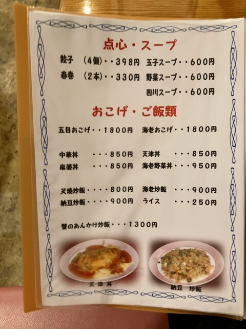 初めての訪問。四川を掲げていらっしゃる店でもあり、多くの方が注文されている麻婆豆腐が食べてみたく、麻婆丼+半ラーメンのセットを注文。まずは伸びてしまう前にラーメンから。スープは鰹っぽいベースに醤油。あっさりしていながら麺にもよく合い、厚めのチャーシューも柔らかくてとても食べやすく、本当に好みのラーメンでした。そしてやはり麻婆豆腐。さすが四川!香り抜群の山椒がビリビリと効いていて、かと言って辛いだけでなく美味い。以前、横浜中華街で食べた麻婆豆腐も美味しかったけど、個人的にはそれ以上かも(過去の記憶が少し曖昧)。とにかく美味しい。料理の美味しさにつられ、ついつい杏仁豆腐も追加オーダー。杏仁豆腐は食事をすると、一人一つまでながらお安くいただけるとのこと。そしてこれがまた美味い。若干柔らかめのプリンに近いミルキーな味わい。あっという間に全てを完食。これが一日目。実はあまりにも美味しかったので、他の物も食べてみたくなり、連日の訪問になってしまいました。二日目、何を頼もうか悩んだ挙句、過去あまり投稿のなさそうな豚肉と野菜の甘酢炒めを注文。これは見てのとおり、見た目から美しく、食欲をそそります。肉はバラ肉をスライスしたものなのか、ブロックではないのでちょっと違いますが、丁寧に揚げてあってほぼ酢豚な感じです。そしてこのバランスの良さ。肉脂のしつこさを感じさせない酢に絶妙な甘さと醤油の加減。付け合わせのサラダやつるむらさきのお浸しなど、出されたもの全てが美味しかったです。とても楽しみな店を見つけました。ご馳走さまでした。