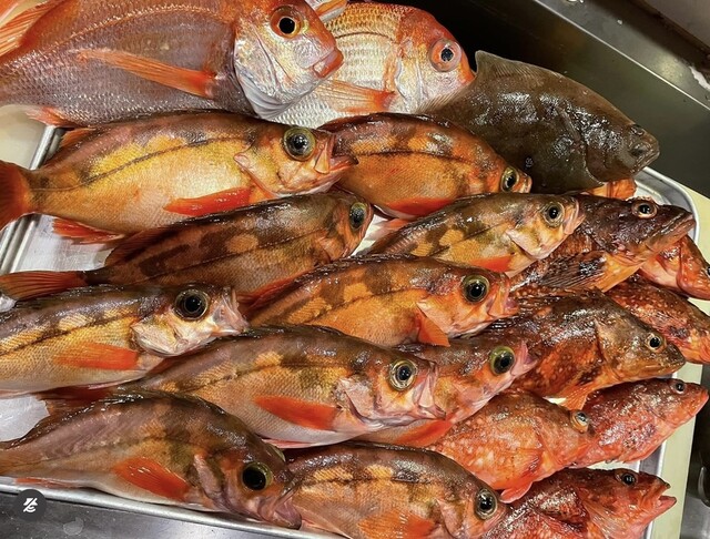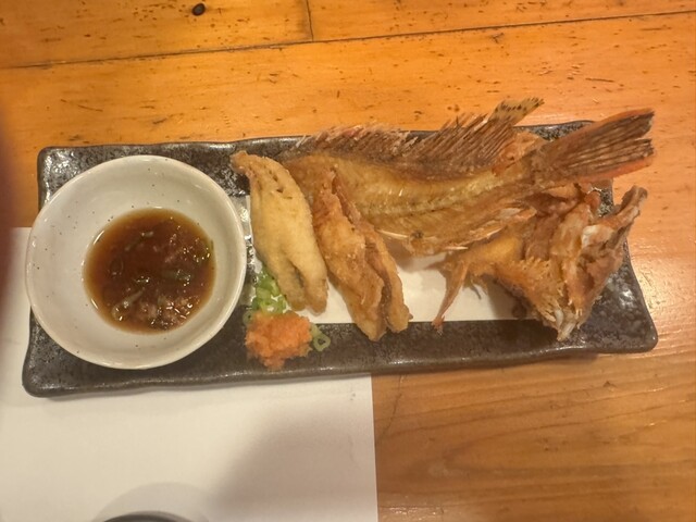 店長が釣って来てインスタにアップしてた、釣りメバルの煮付けに釣りカサゴ唐揚げ、もみじがさとわらびのおひたしとチョット前に店長が釣ってきた鮎の一夜干しで一杯。