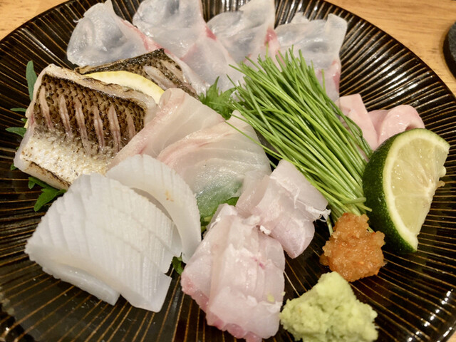 ハーフ&ハーフを呑んで前菜を食べたら、刺身盛り合せ=クエ・鮫カレイ・カマス・太刀魚他が来ました。ポン酢で食べる白身系旨旨。日本酒に移行で、今日は