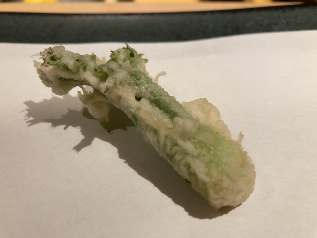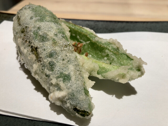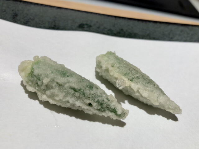 今日の素晴らしかった天ぷらたちの中でも、水蒸気を出し続ける水茄子・ちゃんと苦くてとても甘い稚鮎・江戸前富津の大ぶりのキス・ゴーヤの海老詰め・高知のミニオクラ・清々しいミョウガ・旨旨の鱧2種・レアの子持ち昆布・からすみ大根・インゲン大葉巻き・ブラウンマッシュルームが印象に残っています。