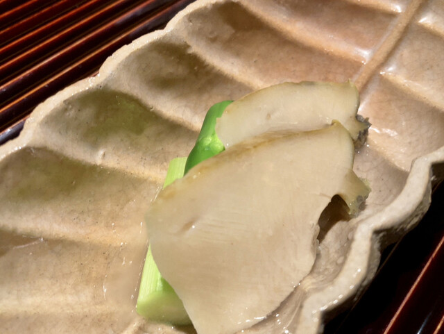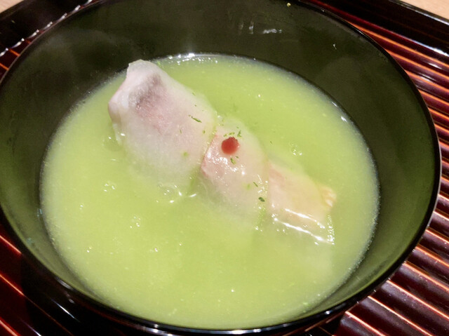 今日の1番の1つ、子持ち鮎には新政。この季節には是非食べたい井本らしい逸品。クレソンと金時草を挟んで、シロアマダイと山口松茸千切り。千切り松茸のお出汁が素晴らしい香り。