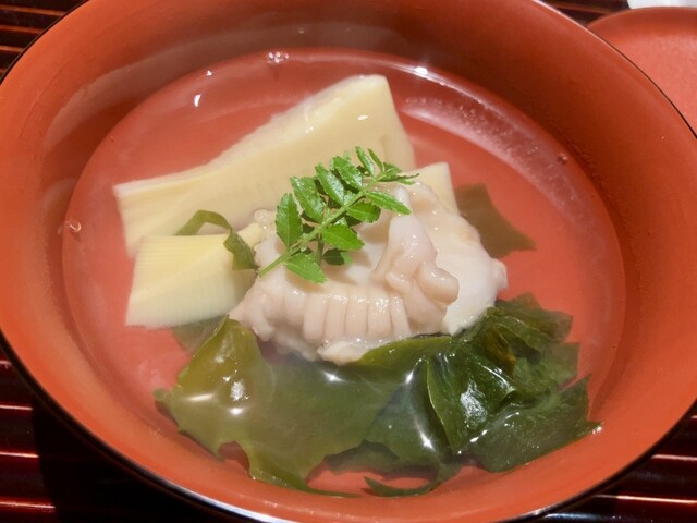 本日のメインの食材は河豚。焼き白子に河豚皮の餡・天然河豚のお椀W/鹿児島の筍にしめの河豚ご飯と素晴らしい品々。河豚皮の餡が素晴らしく美味しく、お椀の出汁が旨旨。最後のサプライズの河豚ご飯は旨み・香り濃く幸せでした。