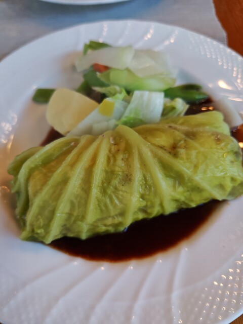 淡泊な鶏肉のロールキャベツを赤ワインのソースで食べさせる一品。