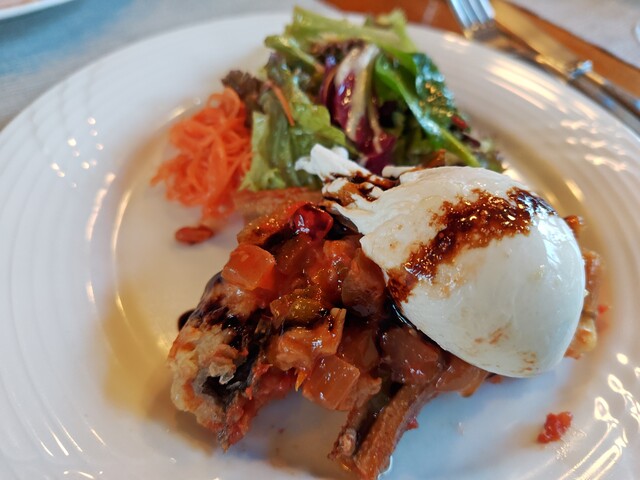「ソイとホタテとアナゴフフリット、ラタトゥイユ、ポーチドエッグ添え」