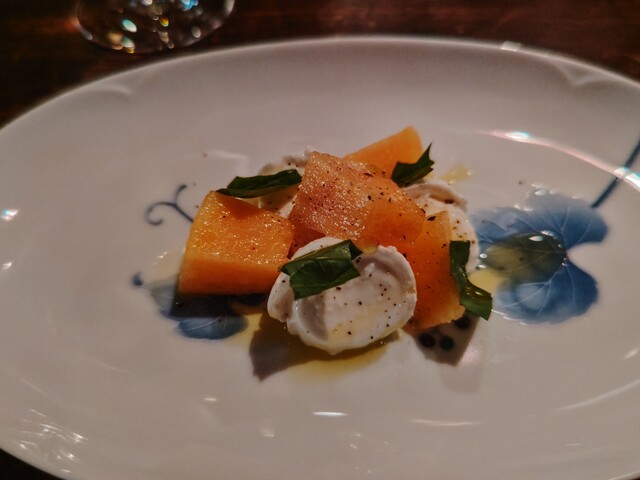 お酒に合わせて、最初の一品は「水牛のモッツアレッラ」とメロンにバジルを組み合わせた