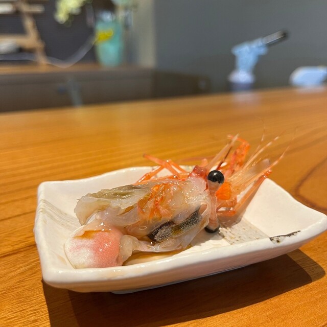 えびは大ぶりな身でシャリにたまごを混ぜ合わせたものを手の上に乗せてもらいいただきました!食感がよく甘味がすごかったです✨