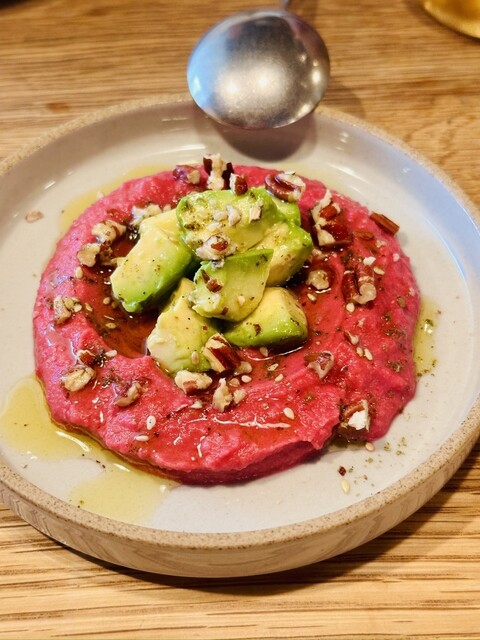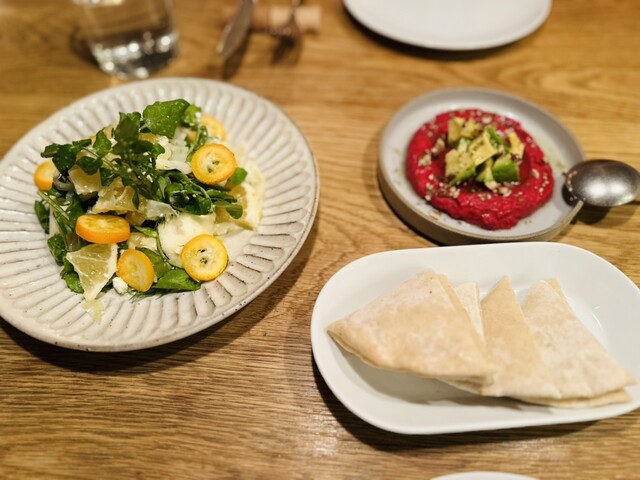 ビーツのフムス、金柑と日向夏とクレソンのサラダ
