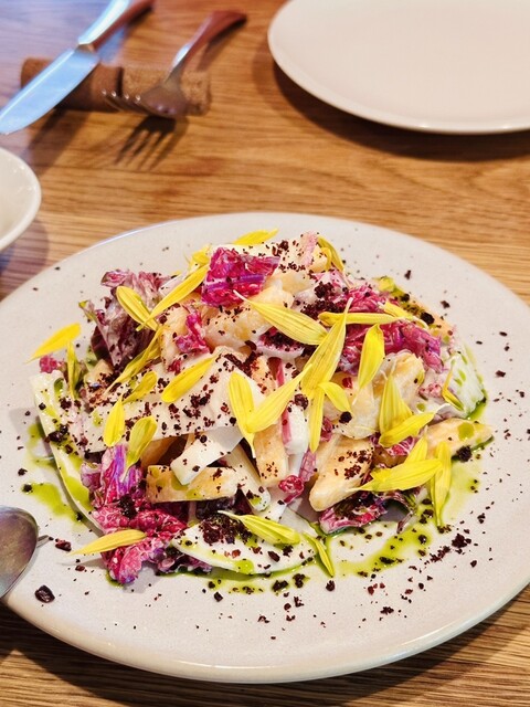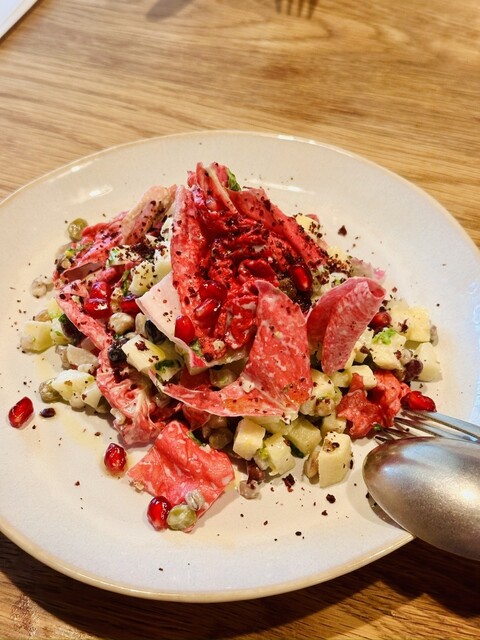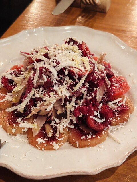 トレビスやカブ、ビーツにグラニースミスやザクロといったフルーツを多彩に組み合わせそこに絶妙に加味されるチーズ
