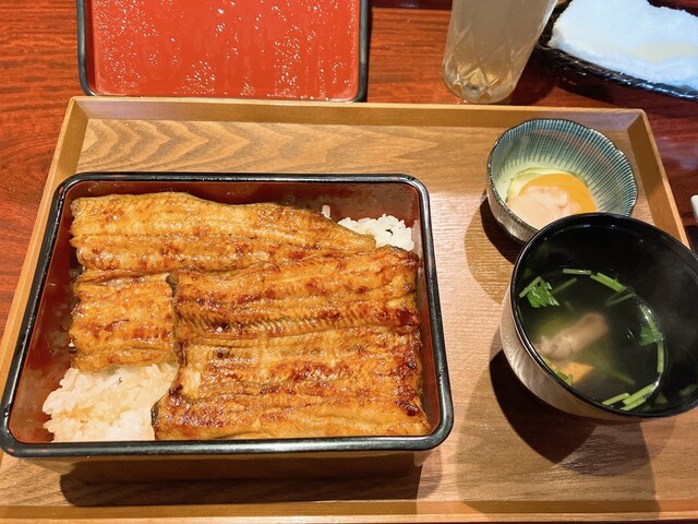 浜名湖産の冬鰻330g超えを1人1本半分、地焼き(関西風)で焼きあげます。こちらは地焼きonlyです。白焼き付き鰻重コース。うざくもあるとの事なので追加も頼みました。