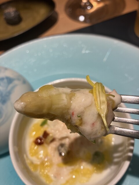 大好きなホワイトアスパラと毛蟹を合わせた一皿、帆立をソテーしてじゃがいものエスプーマにトリュフをかけた一皿。などなど。本当に虜になってます!