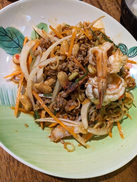 いつもヤムウンセンを頼むのですがいつもと違うものに。味付けはヤムウンセンと同じですが具材はピーナッツ、ひき肉、野菜、海老などなど。美味しかった〜!