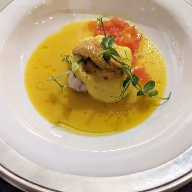 →塩気のあるキャビアがとろっとしていてポーチドエッグと桜ますに絡む。