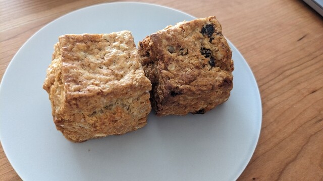 オーツが入っていて外側がザクザクして中はほろしっとりした食感のスコーン。スコーンが好きで色々食べてますがあまり他にはない食感。食べごたえがあって癖になる美味しさです。ノアレザンはフルーティーさもアクセントに。