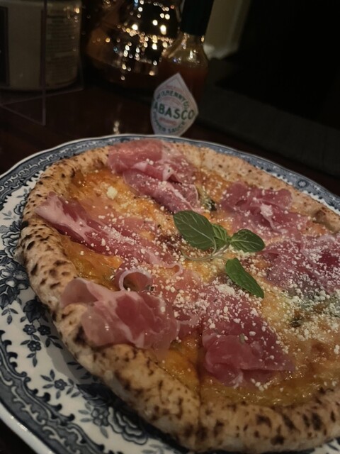 バーテンダーさん手作りのピザ。あっさり塩味で美味しい
