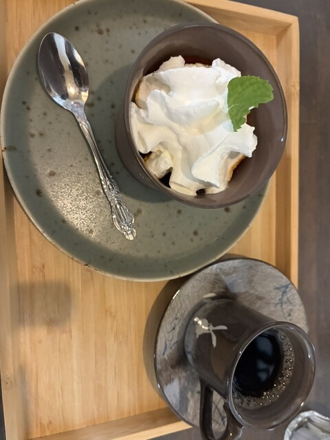 ホットコーヒーとデザートはオーツミルクプリンで。