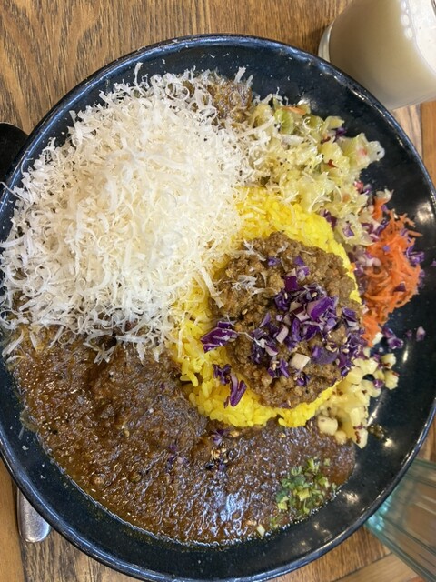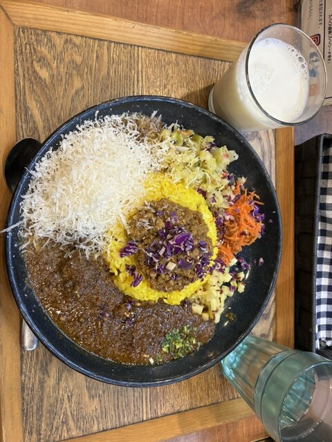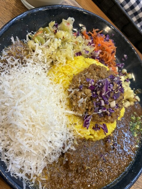 そしてポークジンジャーキーマ。お、肉肉しいねぇ。お味は濃ゆすぎず、そんなに主張のない味。チキンとはまったく違うので、それまた楽しい。キーマはご飯の上にちょこんと少量乗ってる感じ。