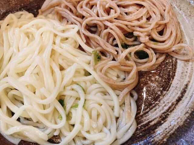 とっても滑らかな白い麺と、ゴツゴツした舌触りの黒い麺。