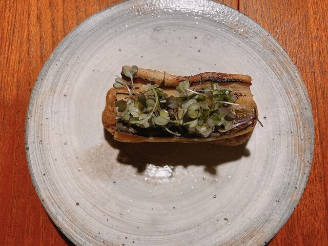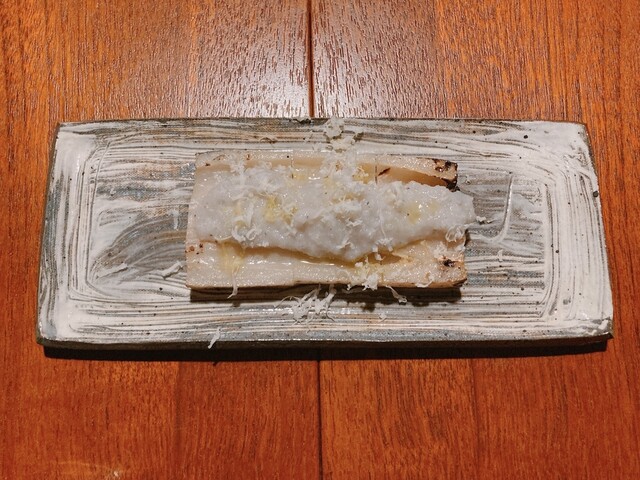 レンコンの上に、すりおろした追いレンコンのソース(?)を載せたもの