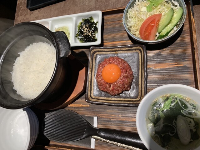 熱々の土鍋ごはんと共に到着!ボリューム満点!土鍋の蓋を開けた瞬間からお米のいい香りがします。最初はお米だけで食べてからごはんの上にユッケを乗せました。夜の単品のユッケとはまた少し違う?気がしました。こっちのほうが肉肉しいかな?お米に合うように作られているのかも?薬味が3種類とも美味しい!ユッケを2杯食べてもごはんが少し余ったので最後はごはんと薬味だけで楽しみました。