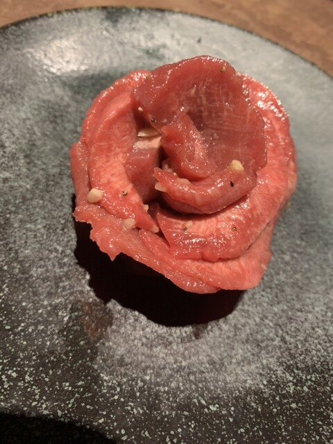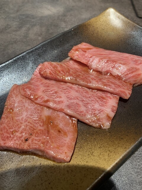 ミスジが大好きなのですがランチでも食べれるのでディナーではあまり頼まないメニュー。大判で薄いお肉はサッサっと焼いていただきます。写真で伝わるかわからないですが同時に2枚焼けないくらい大きいです。というか長いです。1枚ずつ丁寧に焼きます。焼いてる時間すら贅沢。こちらも柔らかいけど溶ける感じはなく、程よく噛み応えがあっていいです。