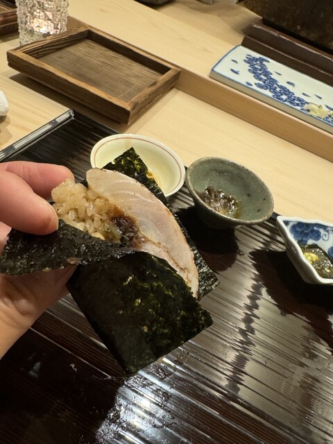 これまた迫力の棒寿司。ノドグロ特有の旨みのある脂と海苔の香ばしさの組み合わせが素晴らしかった。ちなみに、酢飯に冬子椎茸と干瓢が混ぜられており、甘味と旨味もあります。この棒寿司、持ち帰りたかった!